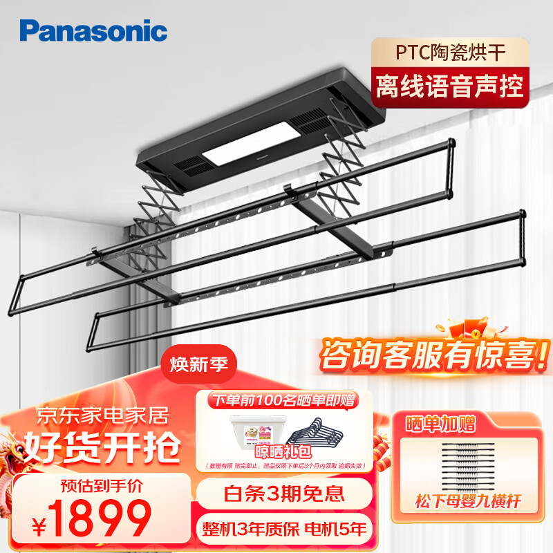 松下(Panasonic)电动智能烘干风干语音超薄嵌入式隐形藏晾衣架LED照明声控晒杆机价格:1899.00元!