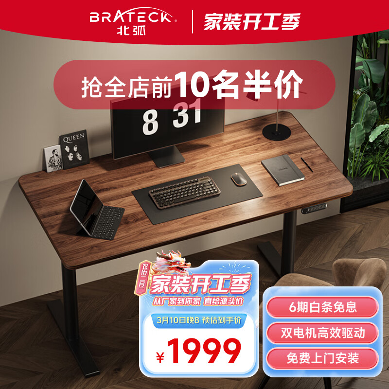 Brateck双电机电动升降电脑桌 北弧站立办公升降书桌 升降台 M1棕1.2米价格:2329.00元!