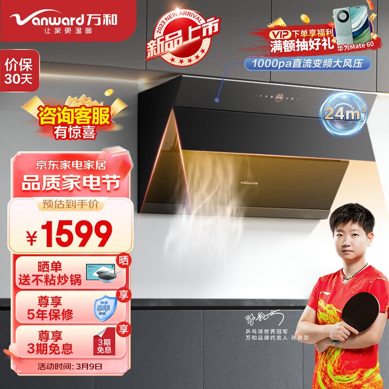 万和(Vanward)侧吸式抽油烟机家用厨房油烟机 24立方米大吸力 直流变频大风压 自清洗 挥手智控吸油烟机WJ920价格:1599.00元!