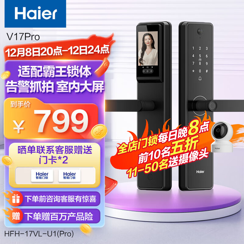 海尔 (Haier) 智能门锁 指纹锁 密码锁 家用防盗门智能联网 防盗门 入户门 木门电子锁 V17Pro霸王锁(3.5英寸大屏+猫眼抓拍)价格:899.00元!