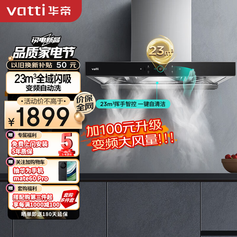 华帝(VATTI)抽油烟机 欧式顶吸三腔大吸力油烟机 23风量低噪挥手智控一键自清洁脱排油烟机 i11178价格:1899.00元!
