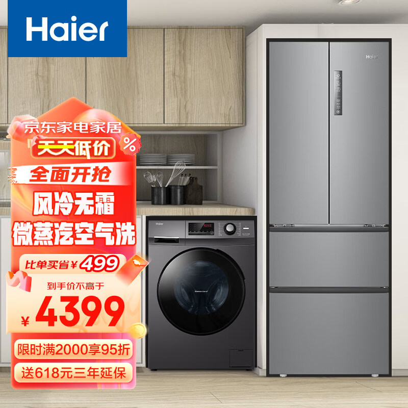 海尔(Haier)冰洗套装 335L超薄法式四开门冰箱BCD-335WLHFD9DS9+滚筒洗烘一体机XQG100-HB106C(附件仅展示)价格:4630.00元!