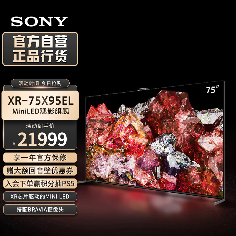 索尼(SONY)【官方直营】XR-75X95EL 75英寸 MiniLED 4K120Hz 旗舰影院电视 智能摄像头 XR认知芯片 京配上门价格:21999.00元!