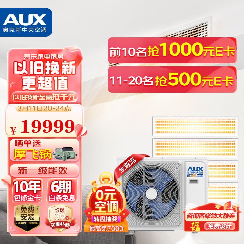 奥克斯(AUX)中央空调一拖四风管机空调多联机5匹一级能效全直流变频快速冷暖智能清洁嵌入式空调DLR-H120W(G1)价格:20599.00元!