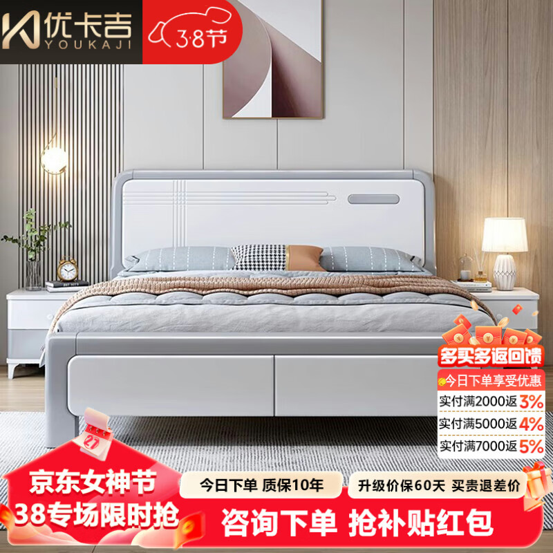 优卡吉实木床现代主卧储物双人床家用收纳高箱床NJ-321# 1.5米气压床+垫价格:3299.00元!