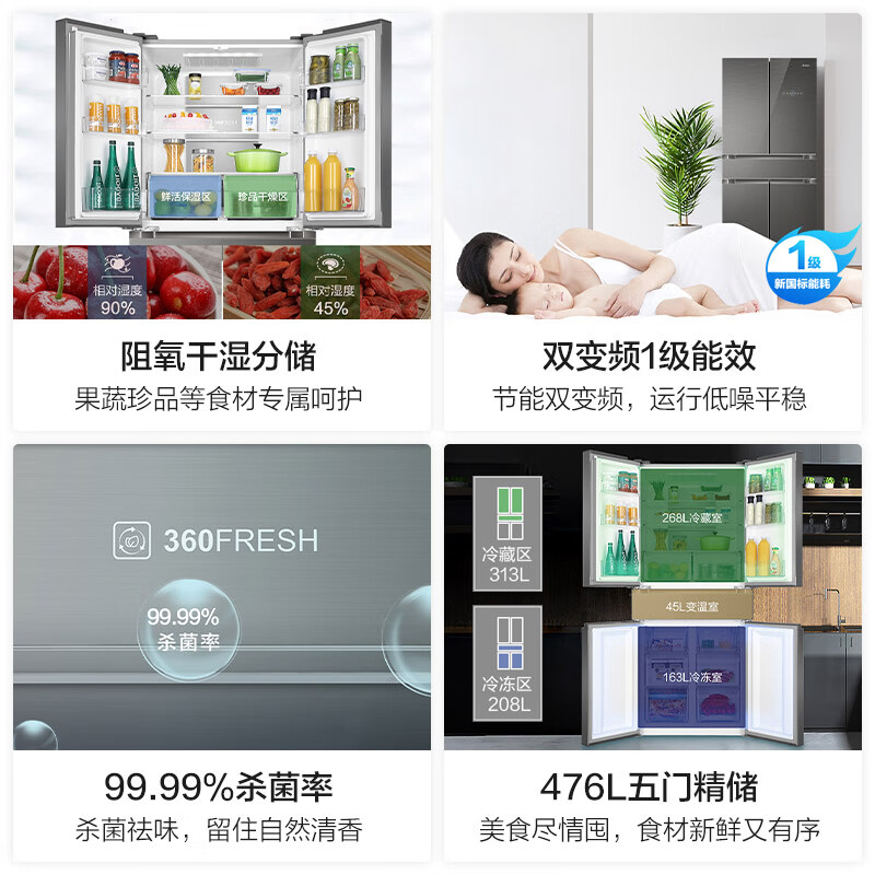海尔(Haier) 476升变频风冷无霜中字多门五门家用冰箱干湿分储母婴空间大容量中门全变温BCD-476WDEUU1价格:5293.70元!