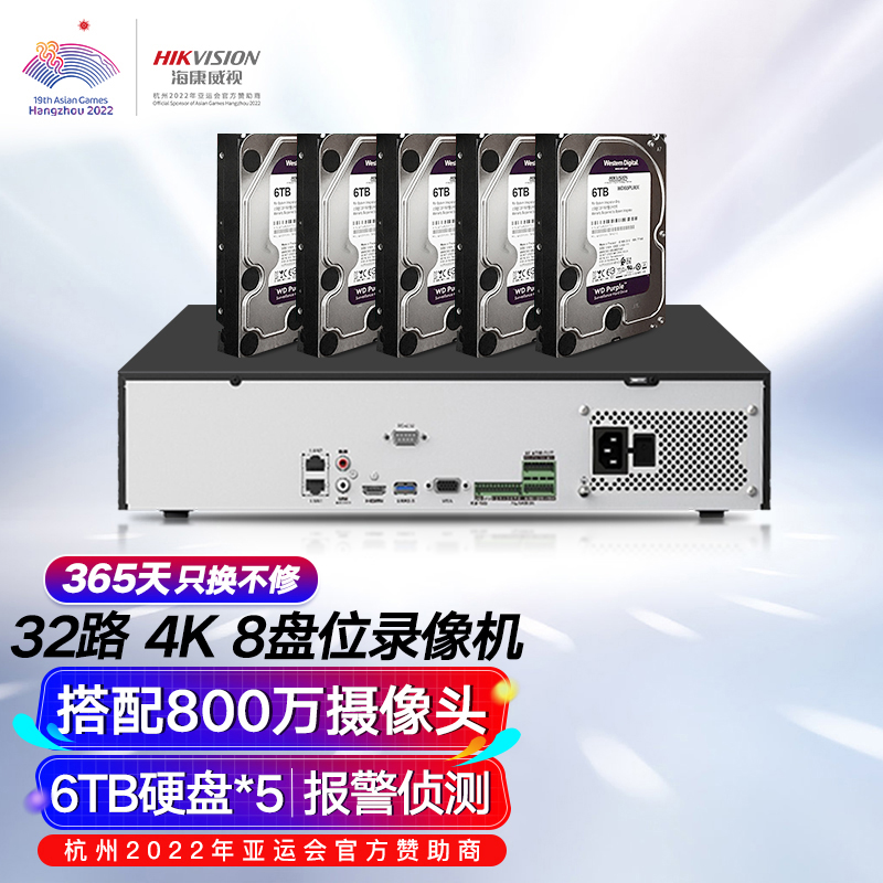 海康威视网络硬盘录像机监控32路8盘位兼容8TNVR满配32个摄像头带6TB硬盘DS-8832N-R8价格:8830.00元!