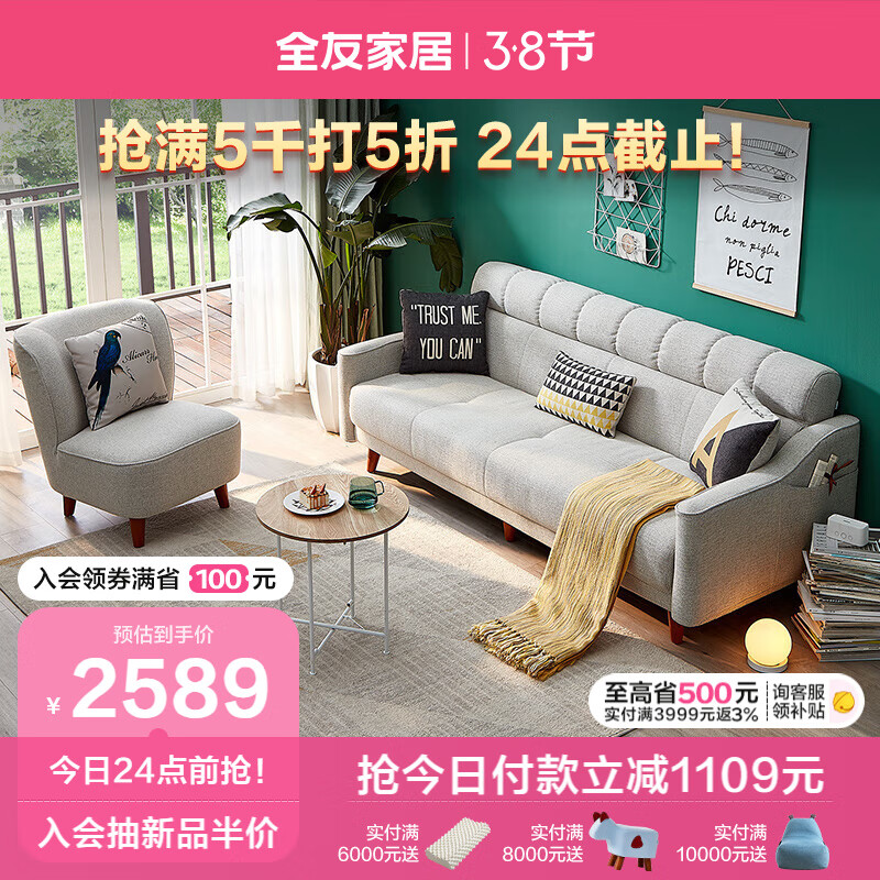 全友家居 现代北欧简约布艺沙发客厅三人位小户型可折叠沙发床102265价格:3698.57元!