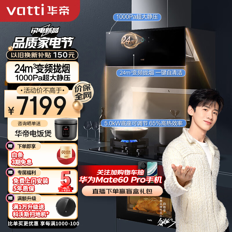 华帝(VATTI)抽油烟机旗舰机王侧吸式变频油烟机燃气灶微蒸烤家用厨房三件套i11193+72B+i23011(天然气)价格:7199.00元!