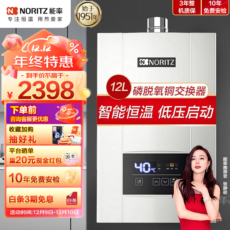 能率(NORITZ)燃气热水器 12升 CPU智能控制系统 智能精控恒温 GQ-12E3FEX(天然气)(JSQ24-E3)价格:2398.00元!