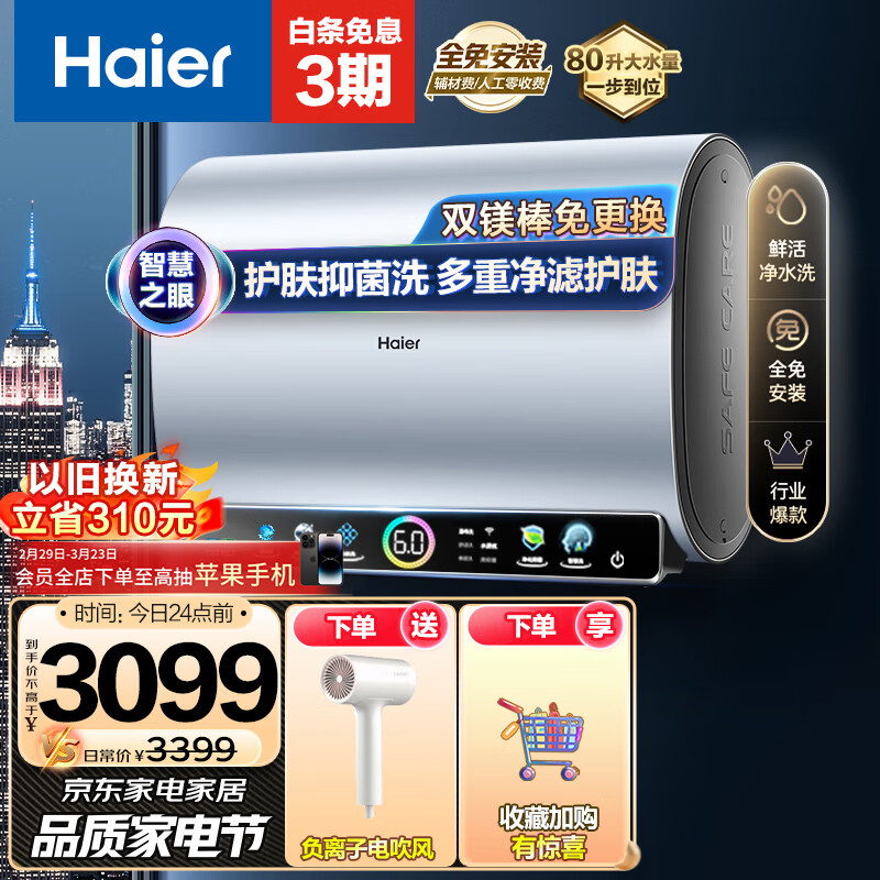 海尔(Haier)80升家用扁桶全隐藏式安装电热水器双3000W速热双胆双镁棒免换EC8003-BOOKU1 【以旧换新】价格:3299.00元!