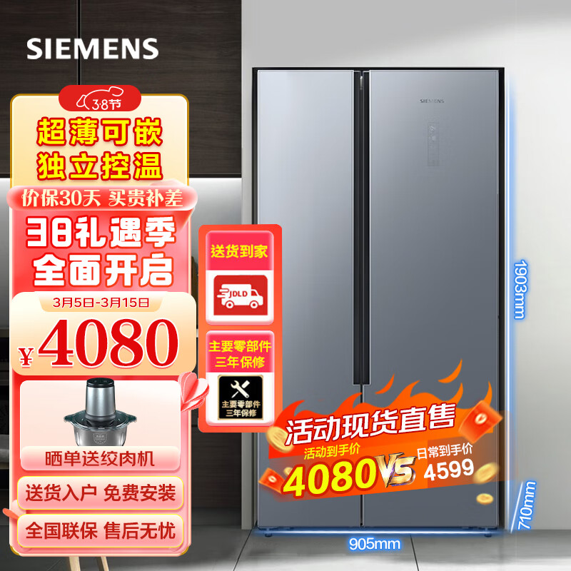 西门子(SIEMENS) 502升对开门双开门家用家电 超薄机身 变频风冷无霜 独立控温KX50NA43TI价格:4080.00元!