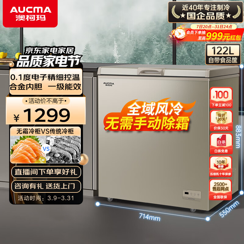 澳柯玛(AUCMA)122升风冷无霜冰柜家用商用单温冷藏柜冷冻柜母乳小冰柜商用小型冷柜冰箱BC/BD-122WD以旧换新价格:1399.00元!