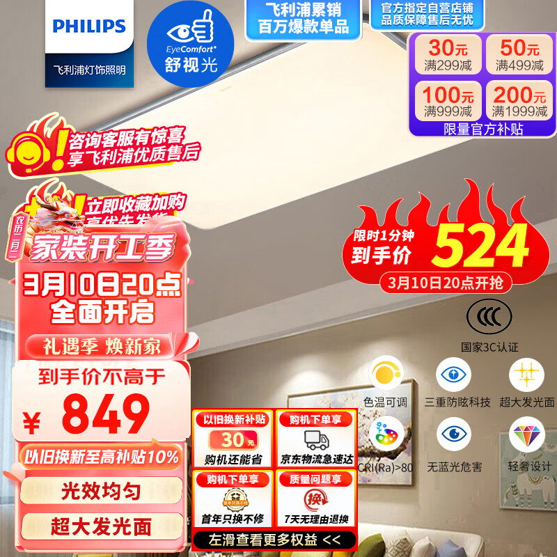 飞利浦LED吸顶灯客厅灯北欧风现代简约客厅卧室 怡轩灰120W价格:1249.00元!