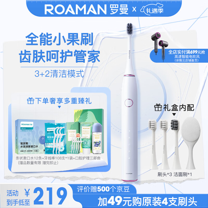 罗曼(ROAMAN)智能声波电动牙刷情侣款生日礼物 5种模式牙医推荐 网红小果刷1年续航 少女白桃款 新年礼物价格:289.00元!