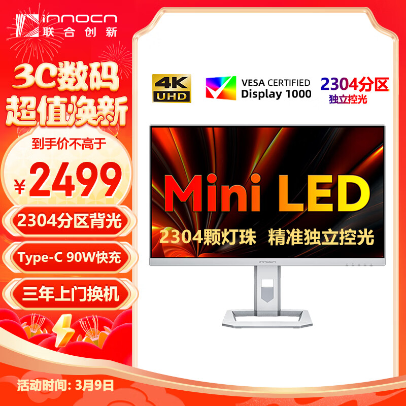 联合创新(INNOCN)27英寸4K MiniLED 2304分区调光 自动感光Type-C 90W旋转升降HDR1000电脑显示器27M2U pro价格:3499.00元!