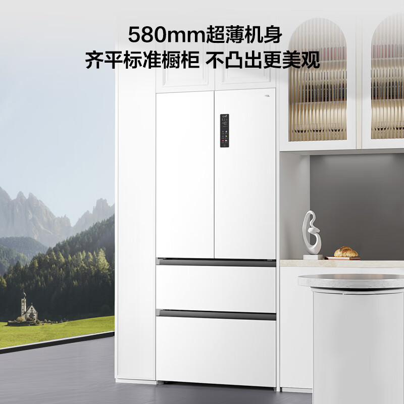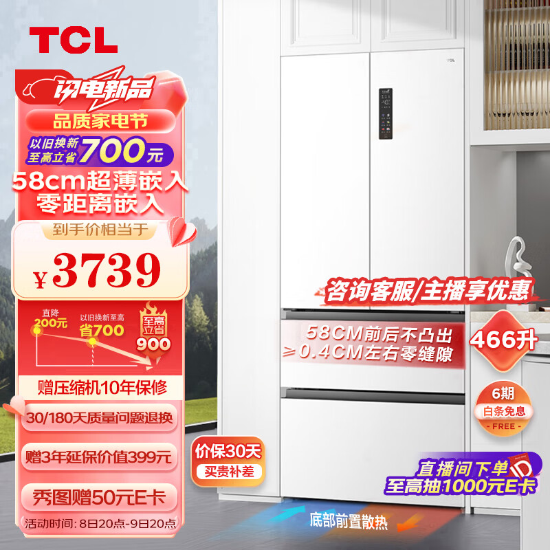 TCL 466升T9法式四开门58cm超薄零嵌入式白色风冷家用电冰箱杀菌除味一级能效大容量双循环R466T9-DQ价格:3739.00元!