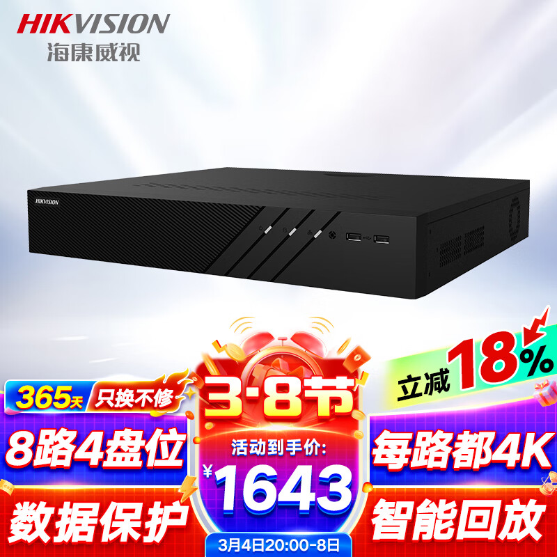HIKVISION海康威视网络监控硬盘录像机8路4盘poe网线供电NVR4K高清兼容10T硬盘DS-7908N-R4/8P价格:1923.00元!