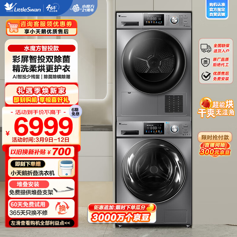 小天鹅(LittleSwan)水魔方洗烘套装 10KG滚筒洗衣机全自动+热泵烘干机 【87+87】智能投放 1.08洗净比 TG100V87MIY+87价格:6999.00元!