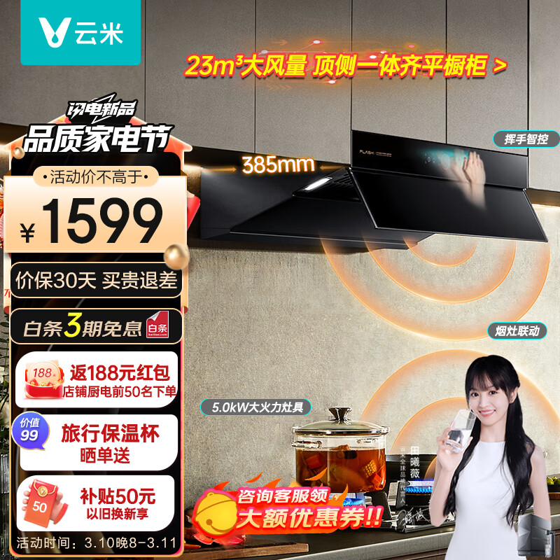 云米(VIOMI)Flash油烟机烟灶套装5.0KW大功率猛火灶23立方吸力侧吸免拆洗挥手智控VK703A+VG307天然气套装价格:1599.00元!