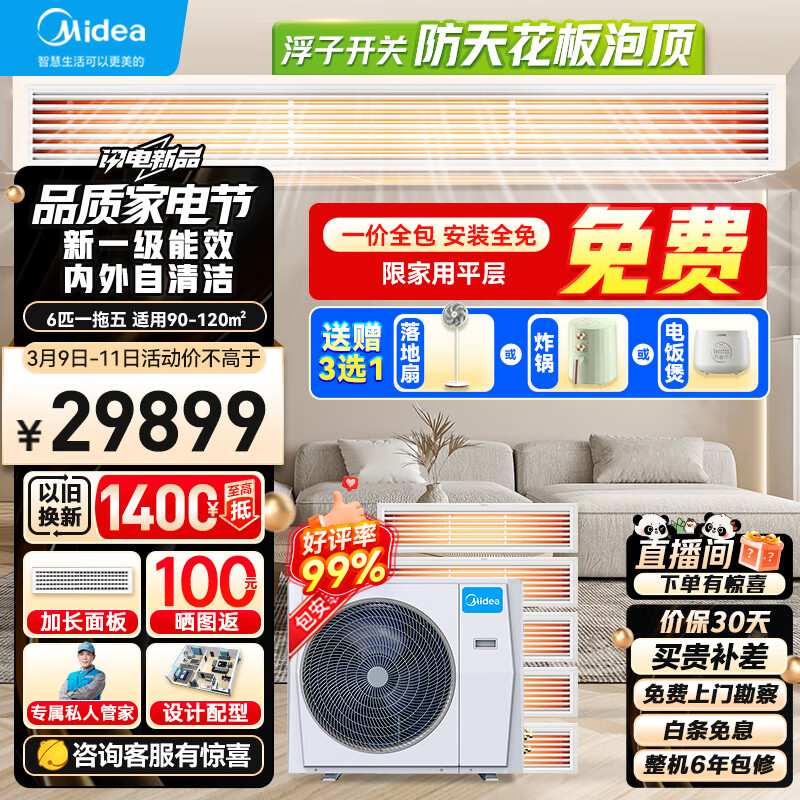 美的(Midea)中央空调一拖五风管机6匹星光多联机新一级能效全直流变频冷暖清洁嵌入式MDS-H140W-A(1)Ⅲ价格:29999.00元!