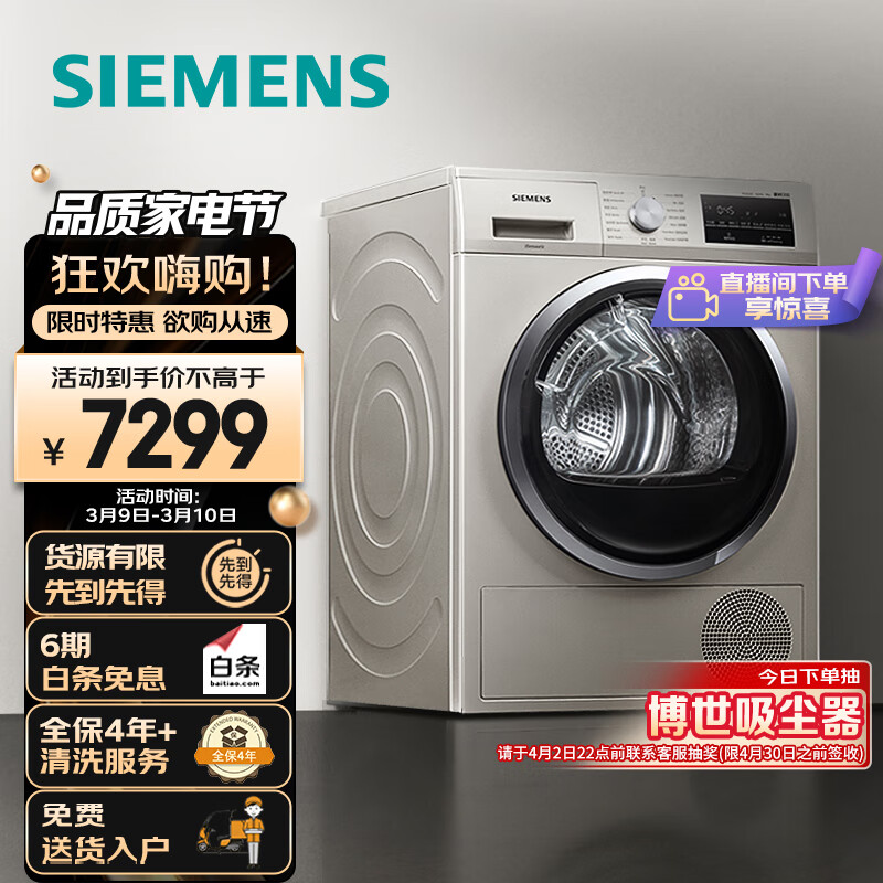 西门子(SIEMENS) 烘干机家用 9公斤欧洲进口热泵干衣机 除菌除螨 低温柔烘均匀干衣 WT47W5691W价格:7299.00元!