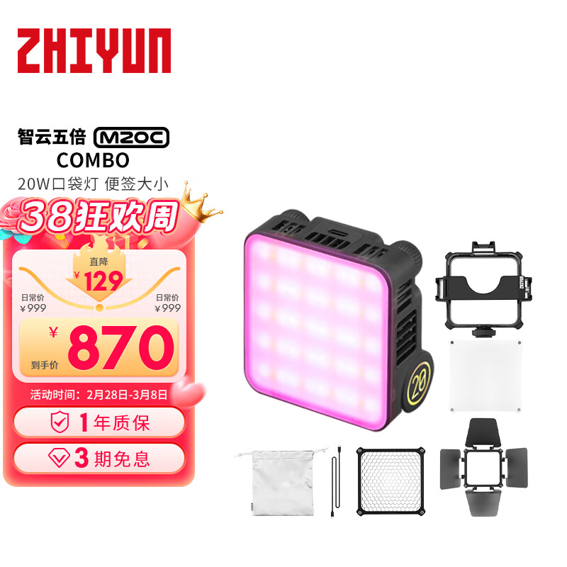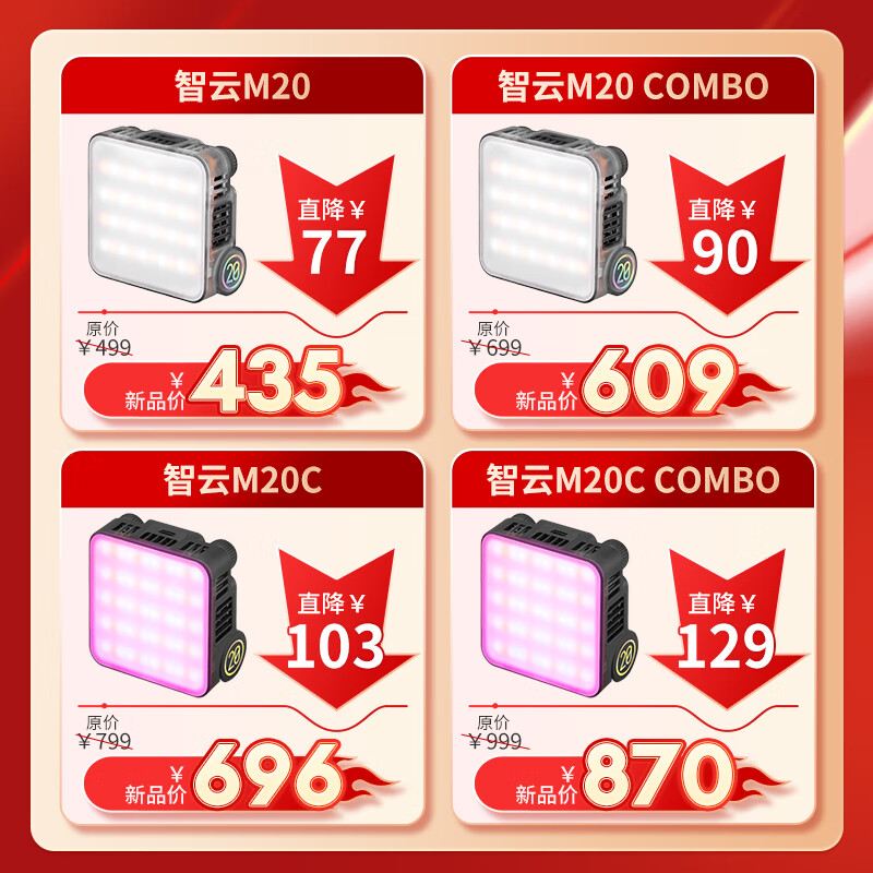 zhi yun智云五倍补光灯M20C 直播补光rgb摄影灯室内led手持便携口袋户外专业拍摄像打光常亮灯M20C COMBO价格:999.00元!