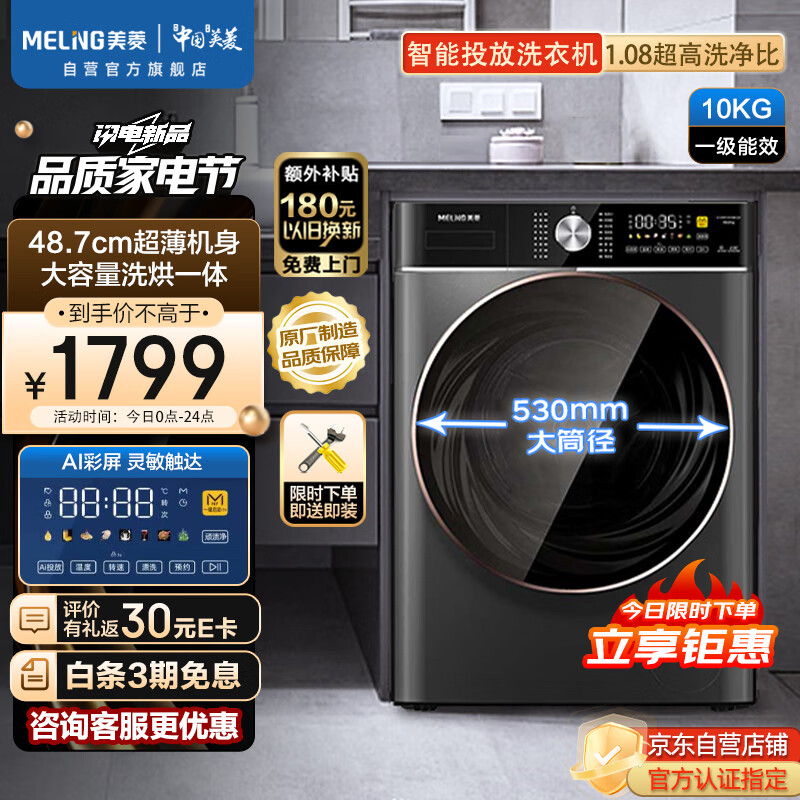 美菱(MELING)10公斤【超薄】滚筒全自动变频洗衣机巴氏除菌高温除螨洗一级能效 G100M14559BCZX价格:1599.00元!