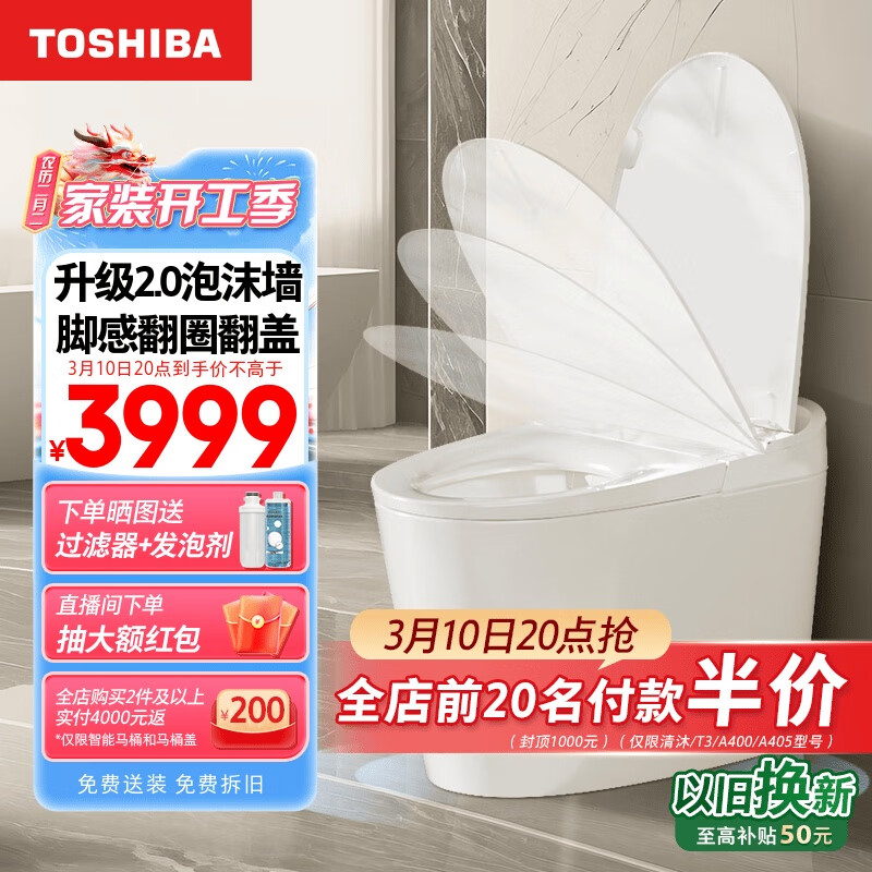 东芝(TOSHIBA)【满配机皇】小海豚pro智能马桶全功能泡沫盾脚感翻圈盖坐便器价格:3999.00元!
