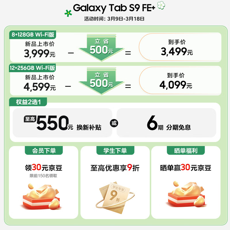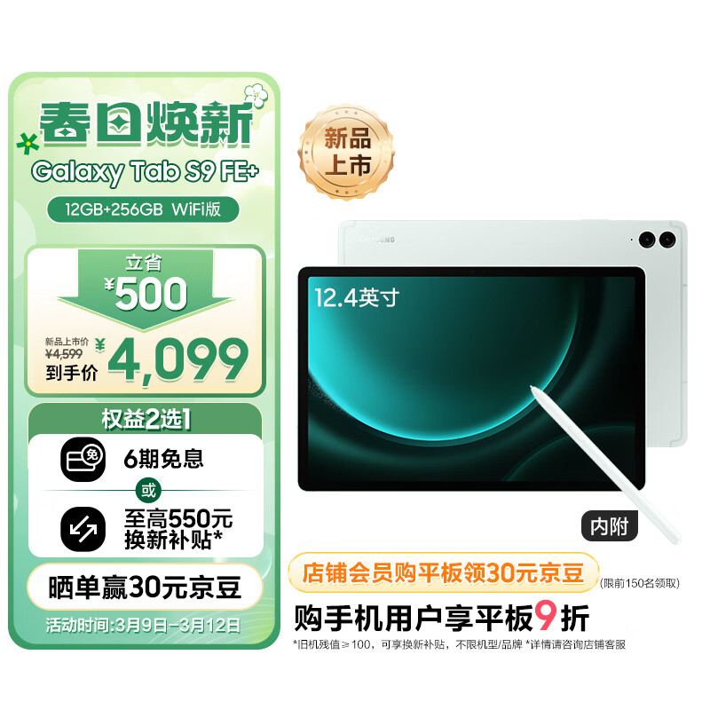 三星(SAMSUNG) S9 FE+2023款Tab平板电脑12.4英寸12+256GBWIFI版护眼高清大屏IP68防水含Spen薄荷绿价格:4099.00元!