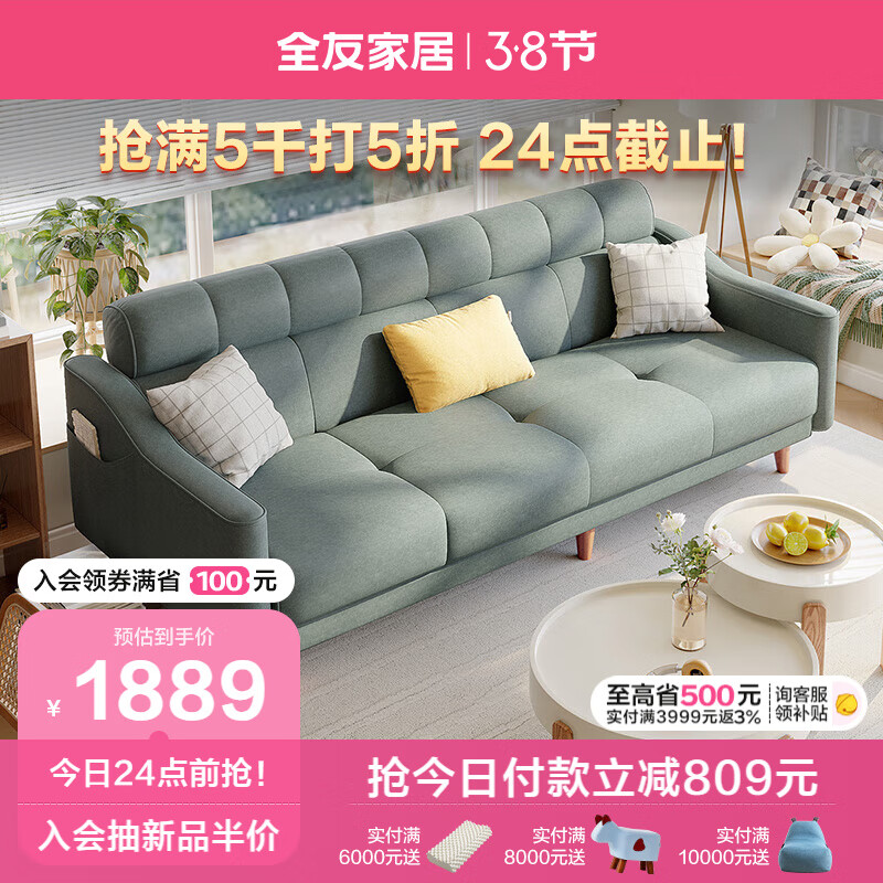 全友家居 北欧简约科技布艺沙发客厅三人位小户型可折叠沙发床102265价格:2698.57元!