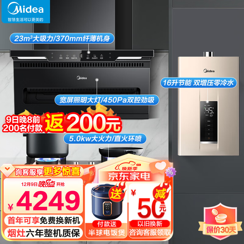 美的(Midea)家用抽油烟机顶侧双吸23立方大吸力油烟机燃气灶具热水器厨房电器三件烟灶套装天然气DC2+330+NT1S价格:4249.00元!