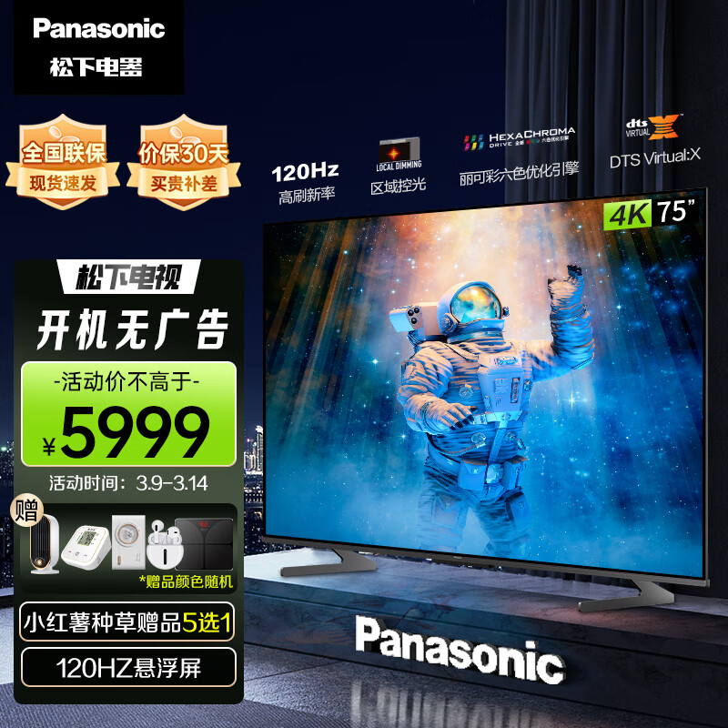 松下(Panasonic)电视LX780 75英寸 三通道120Hz游戏电视 AI语音 杜比视界区域控光低音炮开机无广告 TH-75LX780C价格:5999.00元!