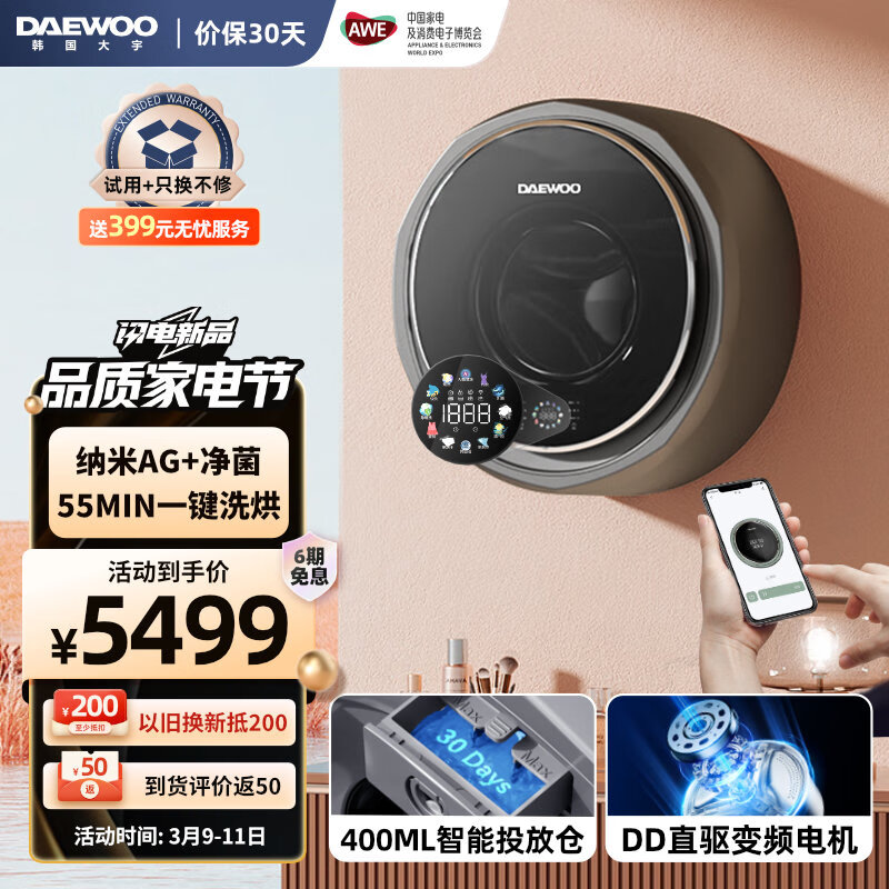 大宇(DAEWOO)壁挂洗衣机 洗烘一体 全自动变频3KG 彩屏WiFi智联 高温煮洗 星云系列 DY-BGX07H 极光银价格:5499.00元!