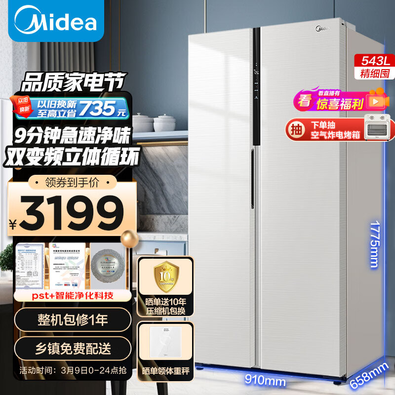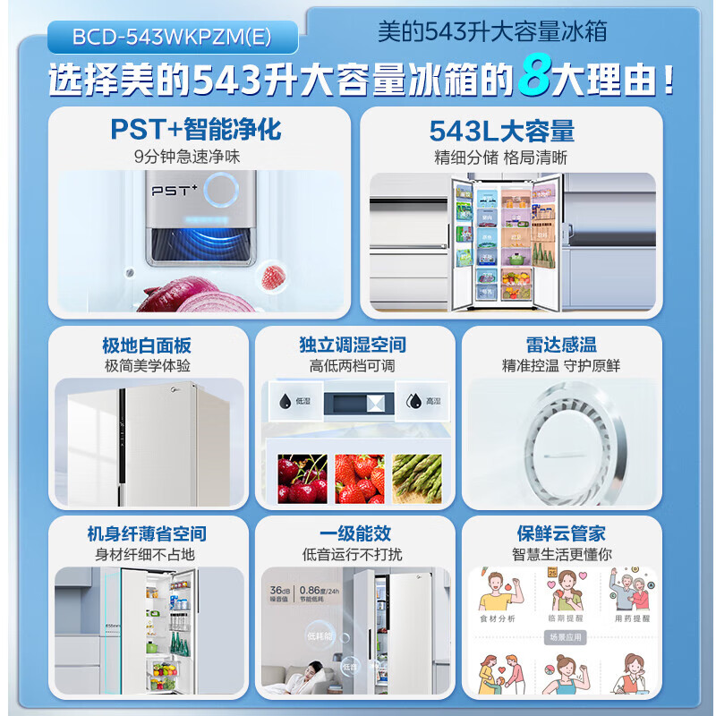 美的(Midea)9分钟急速净味543升对开门双开门白色家用电冰箱一级能效变频超薄大容量BCD-543WKPZM(E)京东小家价格:3999.00元!