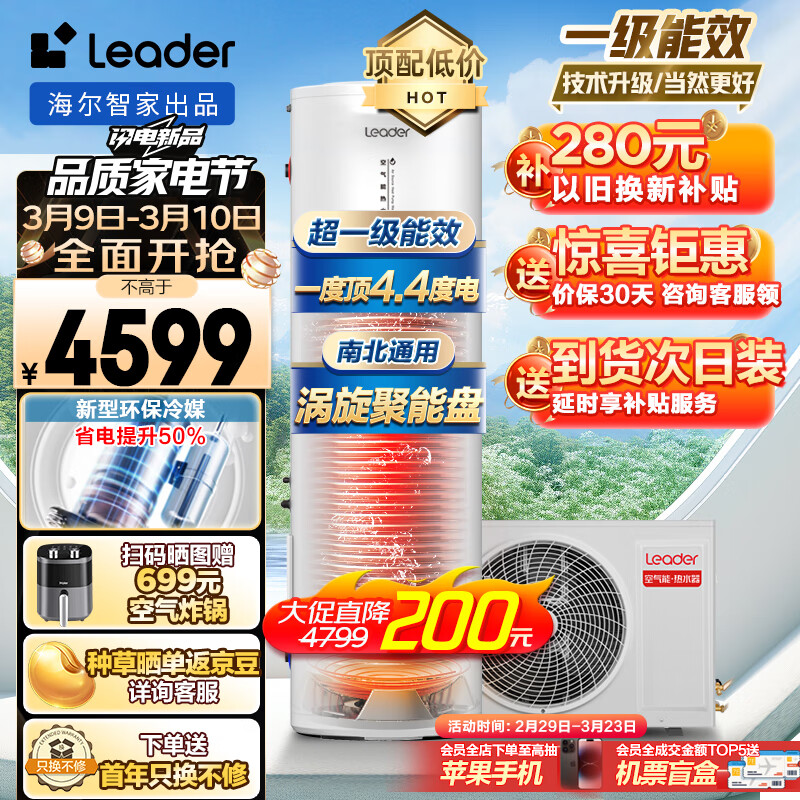 海尔(Haier)智家出品Leader空气能热水器200升包安装 一级能效电辅南北通用升级R32冷媒WiFi PA7U1(4-6人)价格:4599.00元!