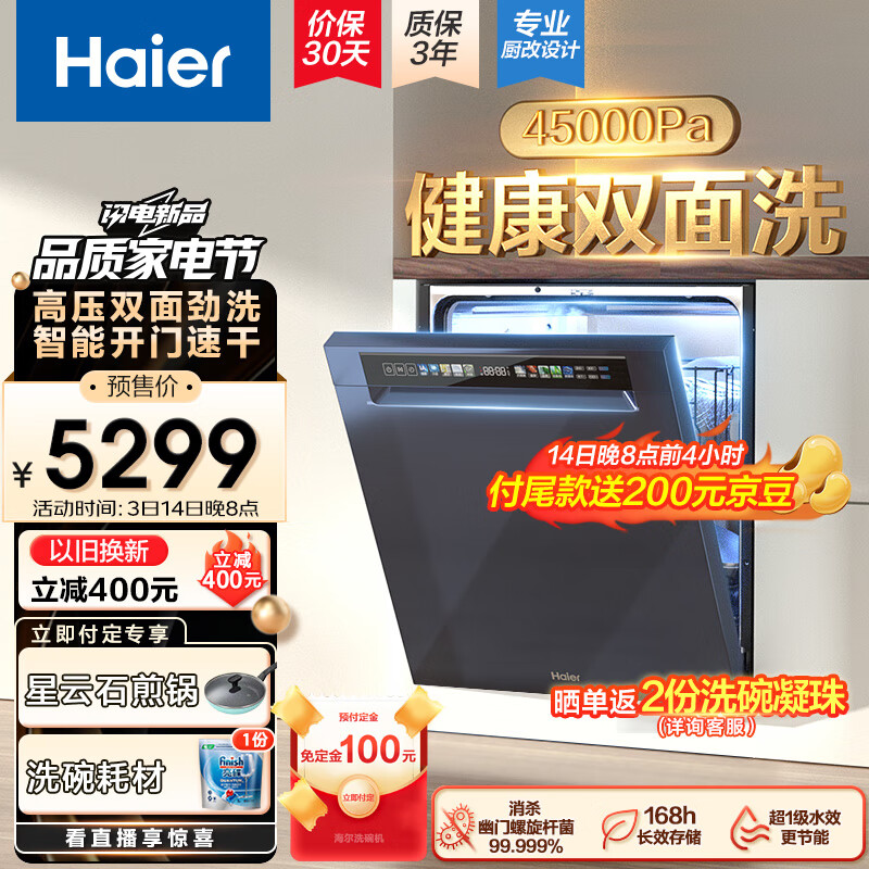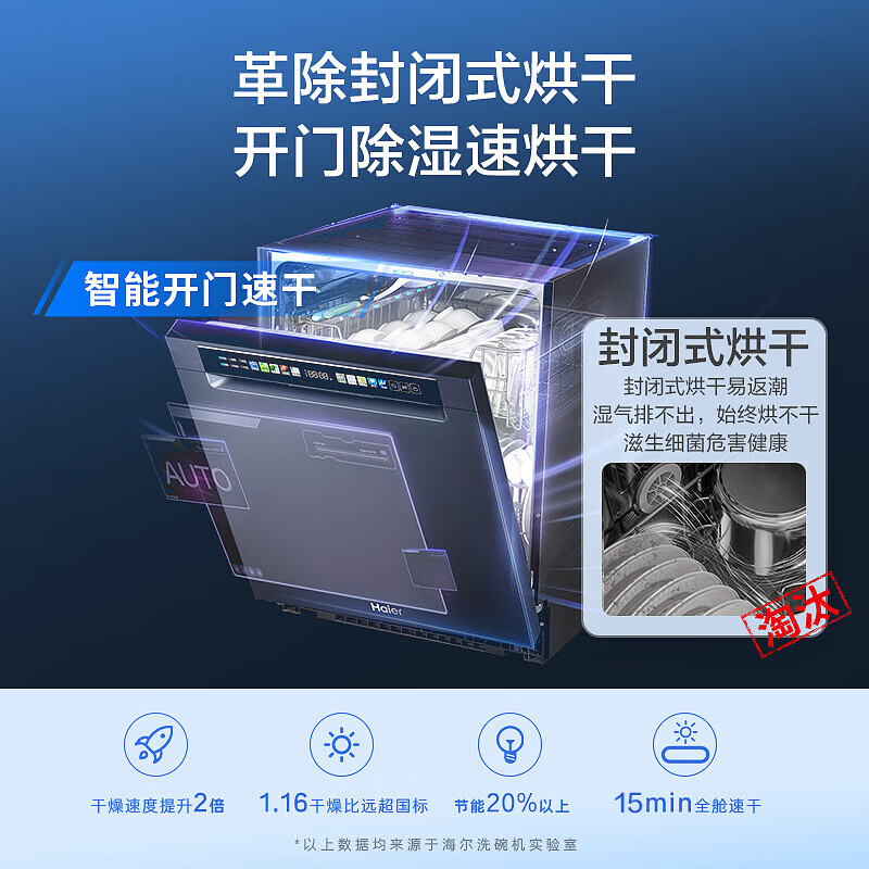 海尔(Haier)15套嵌入式双面洗晶彩洗碗机家用洗消一体W600 一级变频 智能开门速干 健康除菌 EYBW15328JLU1价格:5299.00元!