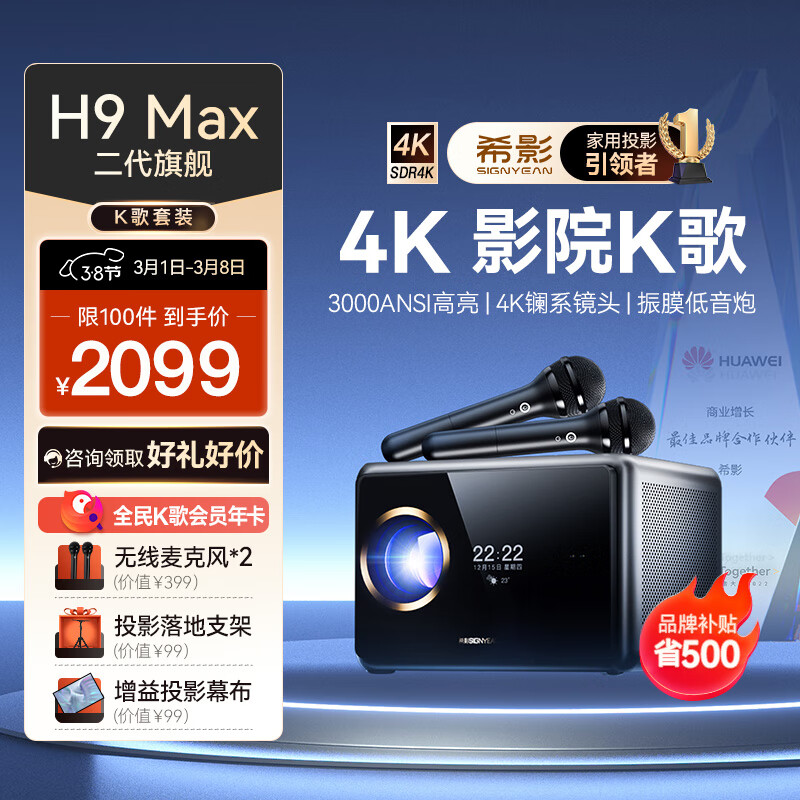 希影H9 Max二代 4K家庭K歌影院 家用投影仪 4K高清智能投影 卧室客厅投影机家庭影院 专属KTV价格:2599.00元!
