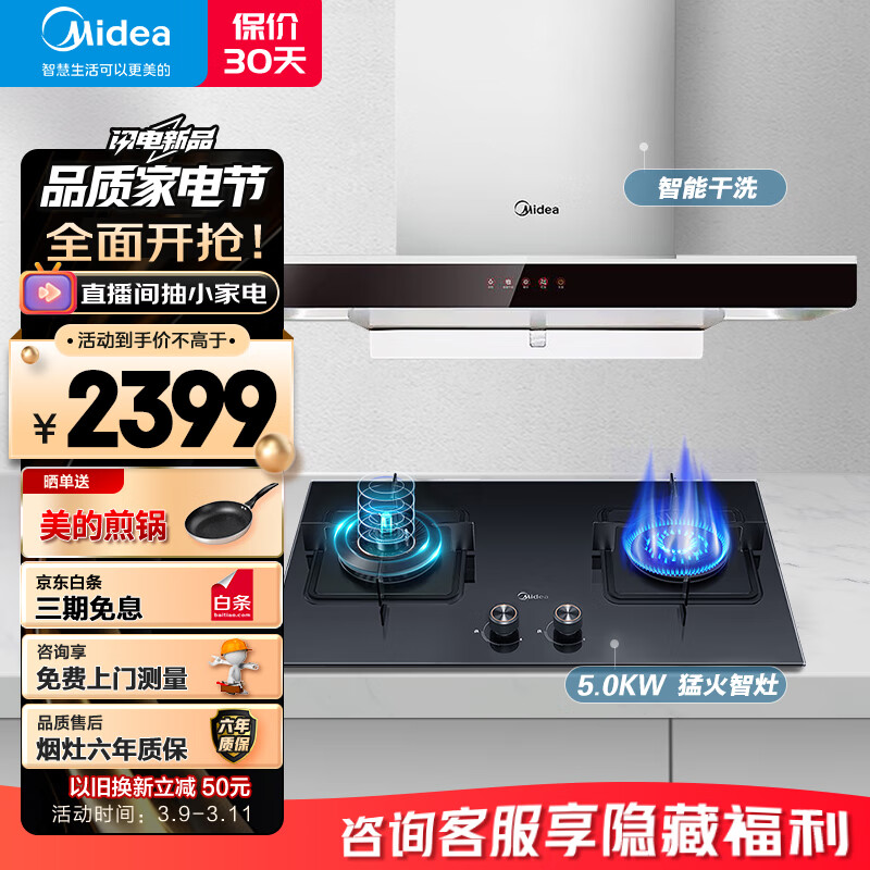 美的(Midea)顶吸欧式抽油烟机 22大吸力 家用厨房油烟机排烟罩 自动清洗 烟灶套装 T36+Q36S(天然气)价格:2399.00元!