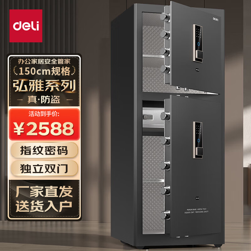 得力保险柜 高150CM双门办公家用保管箱 半导体指纹+触屏密码双重保险 科技布内饰 弘雅AE73-ZM价格:2588.00元!