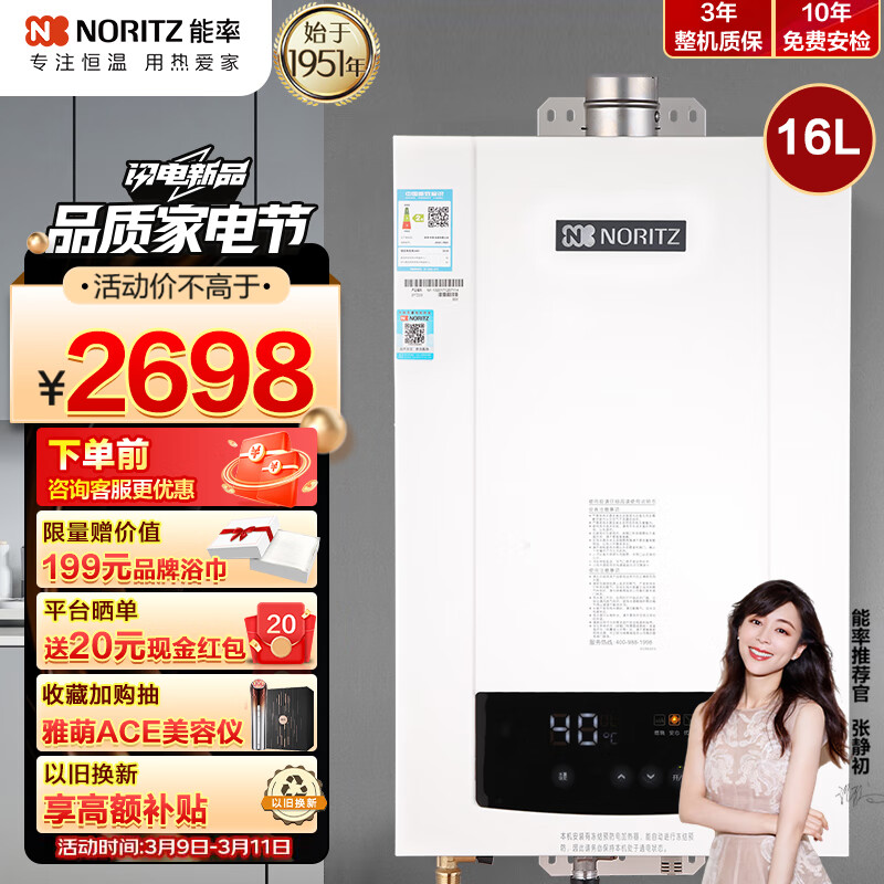 能率(NORITZ)燃气热水器16升 降噪恒温 CPU智能控制系统GQ-16TBG3FEX(JSQ31-TBG3)天然气 防冻家用价格:2698.00元!