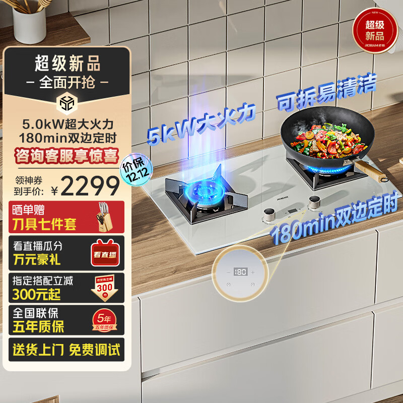 老板(Robam)灵犀燃气灶双灶 家用5.0kW嵌入式定时猛火燃气灶 钢化玻璃灶具灶台白色JZT-37B8XW天然气价格:2299.00元!
