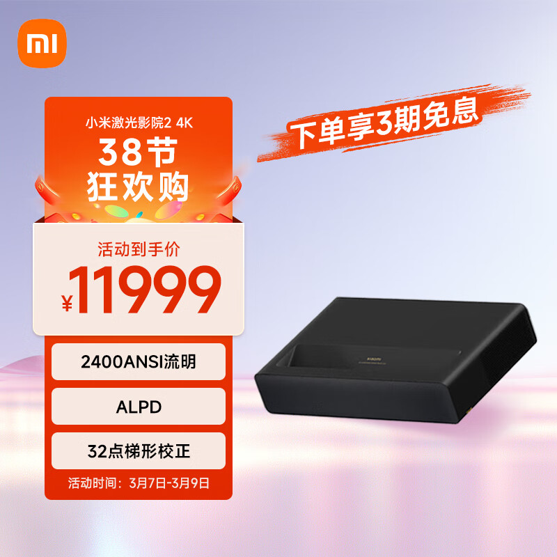 小米激光影院2 4K 100英寸 2400ANSI流明 杜比全景声 ALPD 32点梯形校正 MEMC运动补偿价格:11699.00元!