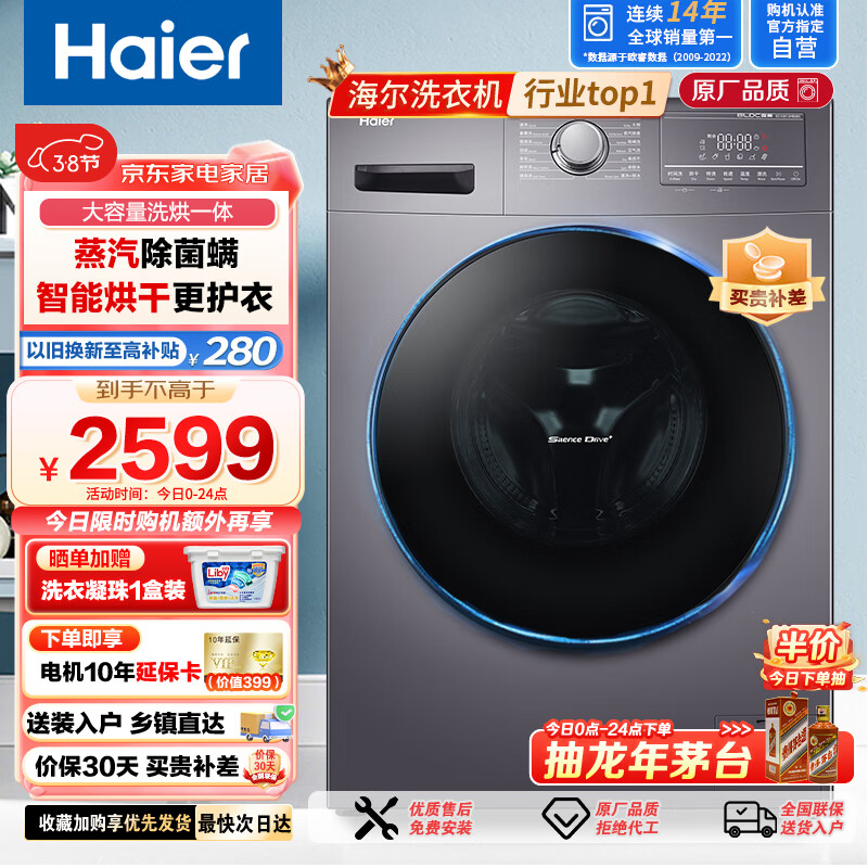 海尔(Haier)洗烘一体洗衣机带烘干 全自动10公斤大容量变频滚筒洗衣机 除菌空气洗香薰洗超大烘干容量以旧换新价格:2599.00元!
