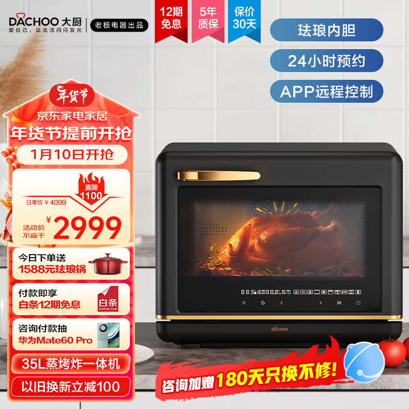 大厨(DACHOO)老板电器蒸烤箱一体机家用台式珐琅内胆烤箱蒸箱35L大容量蒸烤炸一体机 DB610 松露黑价格:5499.00元!