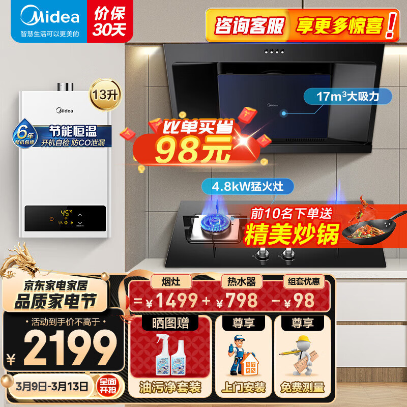 美的(Midea)侧吸抽油烟机灶具烟灶多件套装燃气热水器家用烟灶燃热厨房三件套JP11+Q217B+13HWF天然气价格:2199.00元!