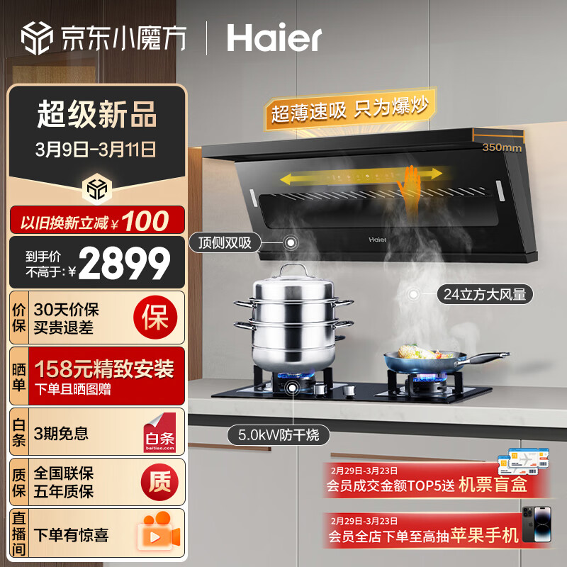 海尔(Haier)抽油烟机 顶侧双吸烟灶套装 24m3/min大吸力 5.0kw防干烧 家用油烟机燃气灶具套装C51+QE9B1天价格:2899.00元!