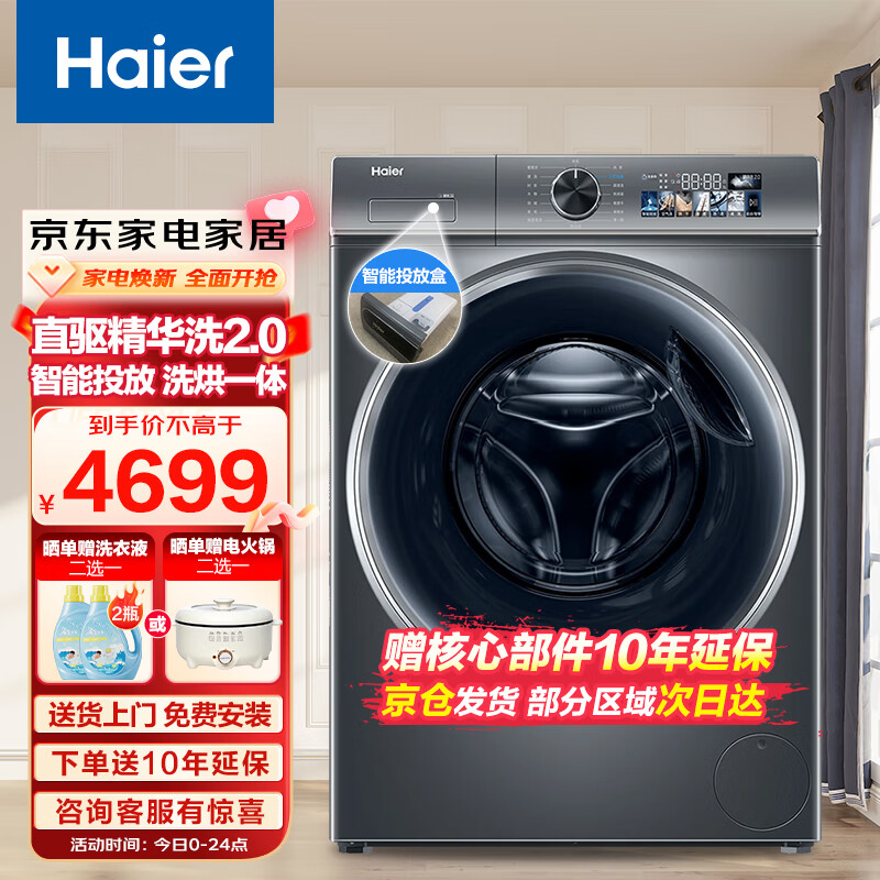 海尔(Haier)【精华洗2.0】10KG滚筒洗衣机全自动直驱变频一级能效智能投放空气洗烘一体XQG100-HBD1266[家电]价格:4699.00元!