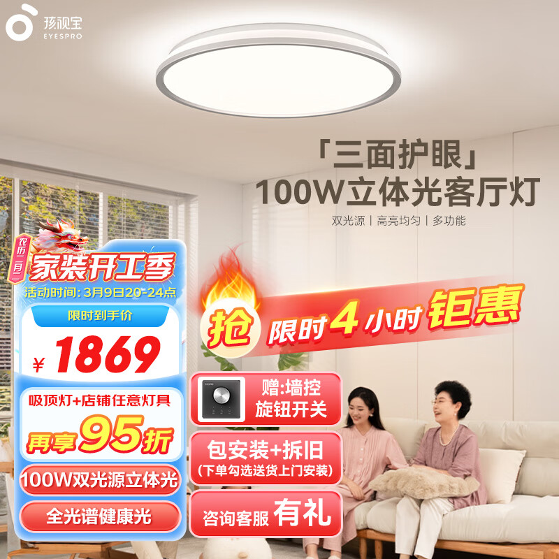 孩视宝客厅大灯护眼吸顶灯卧室书房儿童房防蓝光100W全光谱灯具AH37A-T价格:2119.00元!