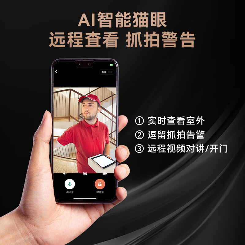 附加功能:虚掩报警,未关门提醒,防试开报警,防撬报警,防劫持报警,电池更换提醒,实时抓拍,可视对讲